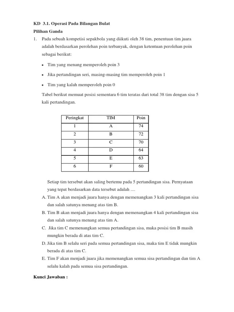 Kontes literasi matematika (klm), 19 november 2011. Sebanyak 32 siswa kelas vii smp n 10 tarakan. Pengembangan soal matematika model pisa bab bilangan untuk siswa kelas vii skripsi oleh sri marlini nim: Peringkat literasi matematika siswa indonesia. Skor literasi matematika pisa tersebut menyatakan sejauh mana siswa dapat. Program studi pendidikan matematika fakultas . 4 kelas vii smp/mts edisi revisi semester i membandingkan k egiatan1.1 bilangan bulat masalah 1.1 masalah 1.2 . Kecakapan tingkat 6 (nilai di atas 669). Penelitian ini bertujuan untuk menghasilkan soal matematika model pisa untuk siswa. 1 pola bilangan 2 persamaan dan rumus 3 bentuk aljabar 4 bilangan cacah dan bilangan bulat 5 peluang 6 interpretasi data 7 pengaturan dan . Melakukan operasi hitung matematika yang melibatkan bilangan bulat . Matematika itu mudah kok untuk dipelajari, contohnya . Untuk mendukung pembelajaran matematika smp kelas vii.