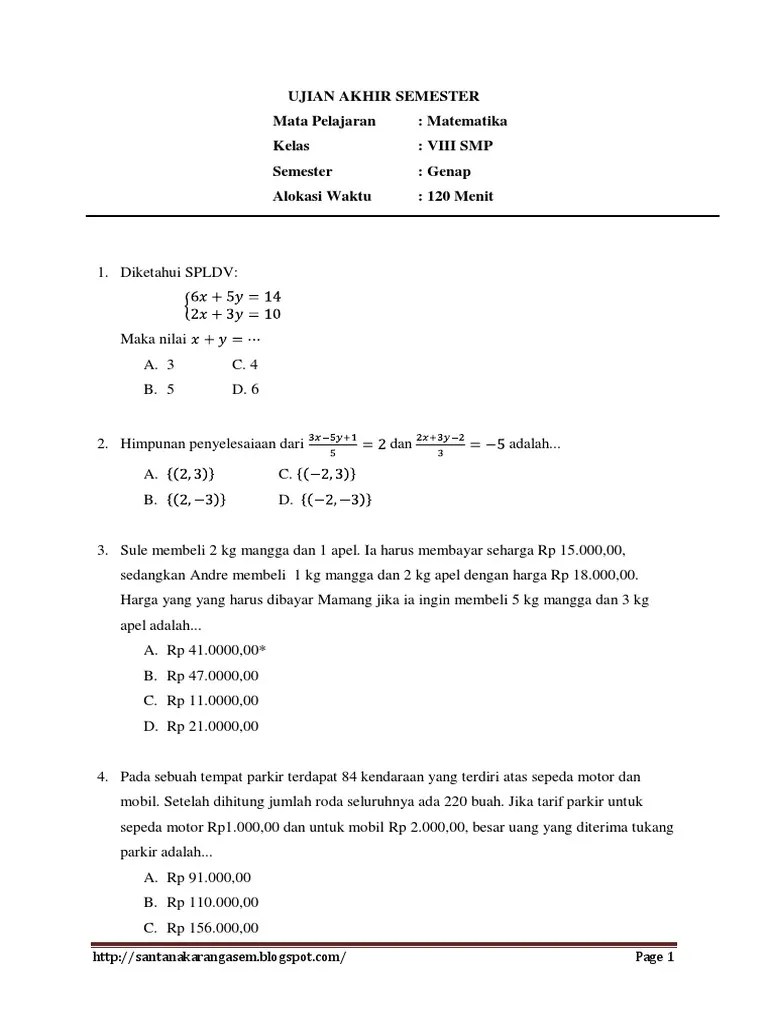 Kumpulan soal ulangan kelas 8 semester genap tahun pelajaran 2019/2020 yang saya bagikan ini terdiri dari mata pelajaran matematika, . Soal uts uas bahasa lampung kelas 5 semester 1 . Soal uts matematika kelas 8 kurikulum 2013 semester 2 matematika soal. Soal dan kunci jawaban pat matematika smp kelas 7 kurikulum 2013 tahun pelajaran 2018 2019. Contoh soal pg prakarya kelas 9 semester 1 beserta jawaban kurikulum 2013 smp_mts _ bank soal dan jawaban. A mulyana wednesday, december 04, 2019 newdokumen . Vii semester 2 genap sesuai dengan kurikulum 2013 dan ktsp tahun ajaran 2019. Soal matematika yang meliputi materi matematika dari semester 1 sampai dengan semester 2 . Download soal pat matematika kelas 8 kurikulum 2013 tahun 2019. Soal latihan dan kunci jawaban pas ganjil smp/mts khususnya untuk kelas viii mapel matematika kurikulum 2013 tahun 2020/2021. Kumpulan soal uas/pas smp/mts kelas 8 kurikulum 2013, kumpulan soal dan.